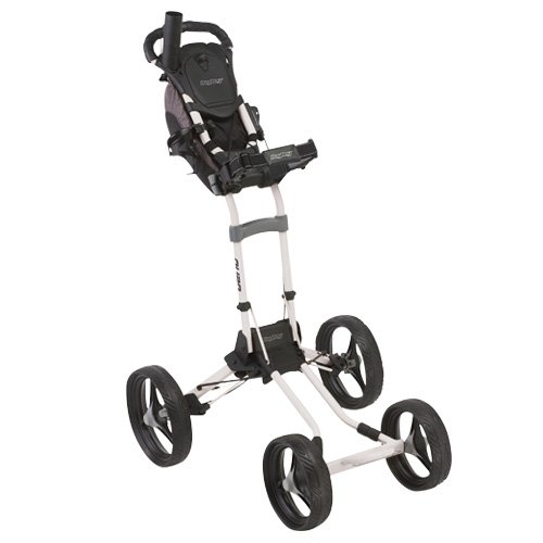 I found a nice three wheeled bagboy on clearance and almost made the purchase until I saw the quad. Taking it down from a high shelve I noticed how light it is. One pull and the quad folds down really small, smaller than any three wheeler.